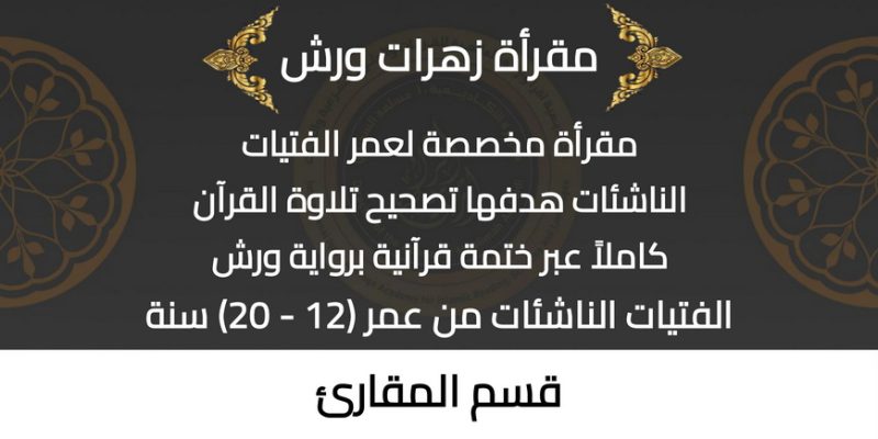 مقرأة زهرات ورش مقرأة مخصصة لعمر الفتيات الناشئات هدفها تصحيح تلاوة القرآن كاملاً عبر ختمة قرآنية برواية ورش بالإضافة للعديد من الدورات المتنوعة