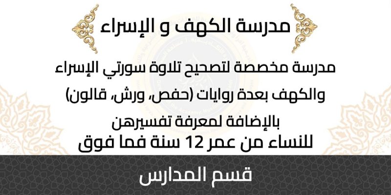 مدرسة الكهف والإسراء مدرسة مخصصة لتصحيح تلاوة سورتي الإسراء والكهف بالإضافة لمعرفة تفسيرهن وغيرها الكثير من الدورات وذلك بصحبة مجموعة من المعلمات ا...