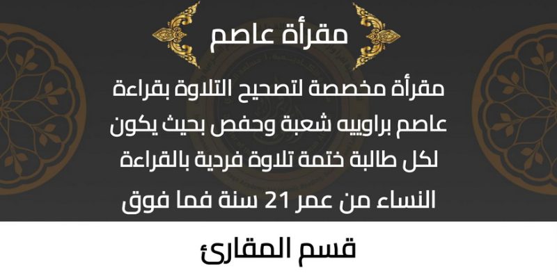 مقرأة عاصم مقرأة مخصصة لتصحيح التلاوة بقراءة عاصم براوييه شعبة وحفص بحيث يكون لكل طالبة ختمة تلاوة فردية بالقراءة