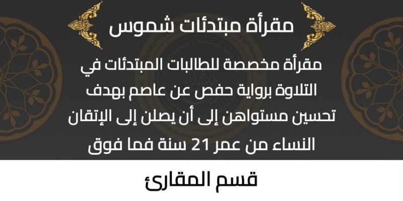مقرأة مبتدئات شموس مقرأة مخصصة للطالبات المبتدئات في التلاوة بهدف تحسين مستواهن إلى أن يصلن إلى الإتقان